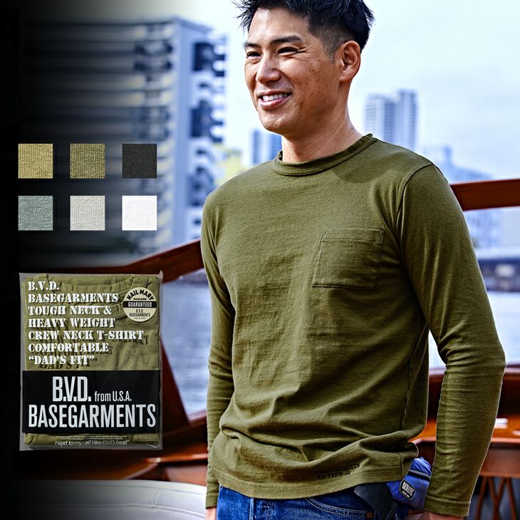 ターゲットになったのがB.V.D. の人気アウターT である「ヘビーウエイトT」。着こんで洗うほどにヴィンテージのような風合いが増すラギッドな生地、体型をスマートに見せてくれる絶妙なシルエット、リピート購入するダッズファンが増え、B.V.D. の新たな定番に成長している。今回はクルーネックT のボディを生かし、ベースガーメンツ版として、よりタフに進化させたハイグレードなアウターTに仕上がりました。