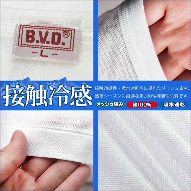 他の画像を見る B.V.D. 綿涼 接触冷感メッシュ V首スリーブレス 涼感 吸汗速乾 通気性 綿100%(M/L/LL)GR900 定価 ¥ 1,980 のところ 販売価格 ¥ 1,188 税込 カートに入れる お気に入りに登録する